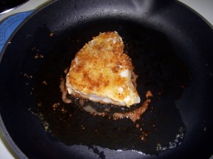 4. Rinse the saute’ pan and place over medium-high heat, and add butter and oil. When hot, place fillets, panko-side down, in the pan and saute for about 2 minutes over medium heat or until panko coating is lightly browned. Turn carefully and saute another 2-3 minutes..