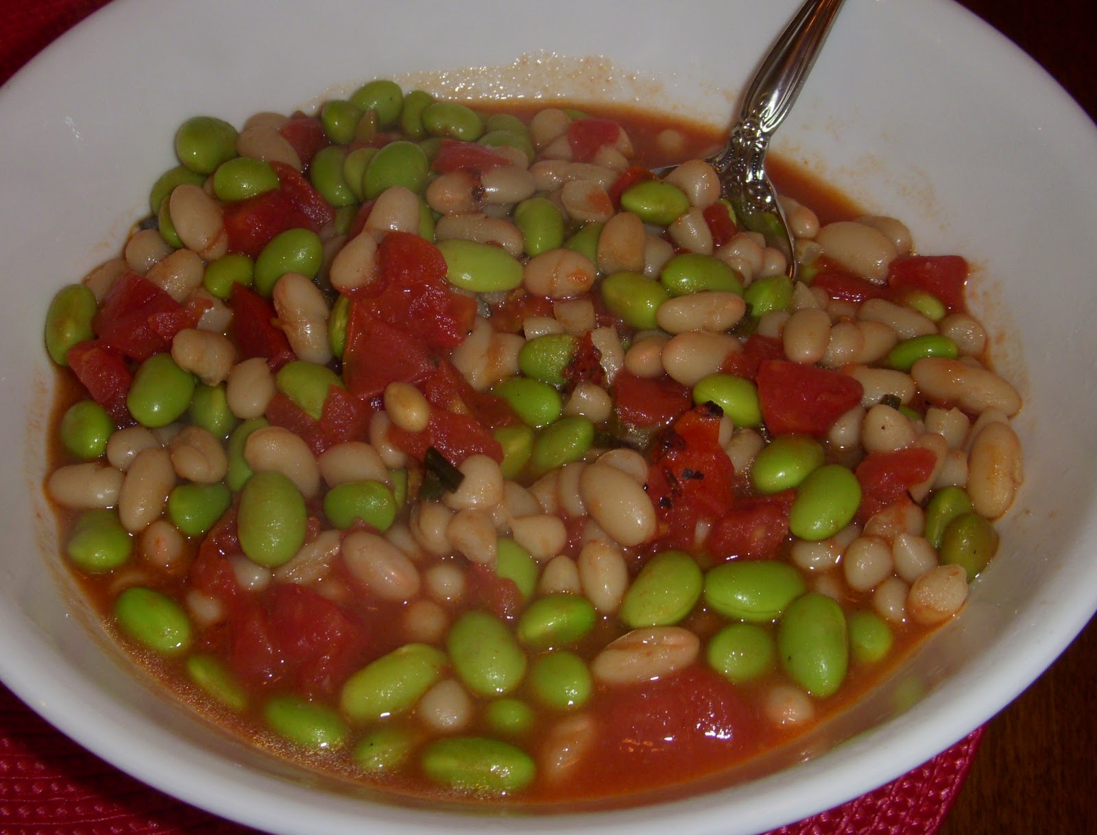 3. Place a large saute’ pan or skillet over medium-high heat and add olive oil. When hot, add the scallions and saute’ for about a minute. Add edamame and tomatoes and cook about a minute or until hot. Add the drained beans, chicken broth, and parsley (optional). Season to taste with salt and pepper. Transfer ragout to a serving bowl or plates. Cover to keep warm.