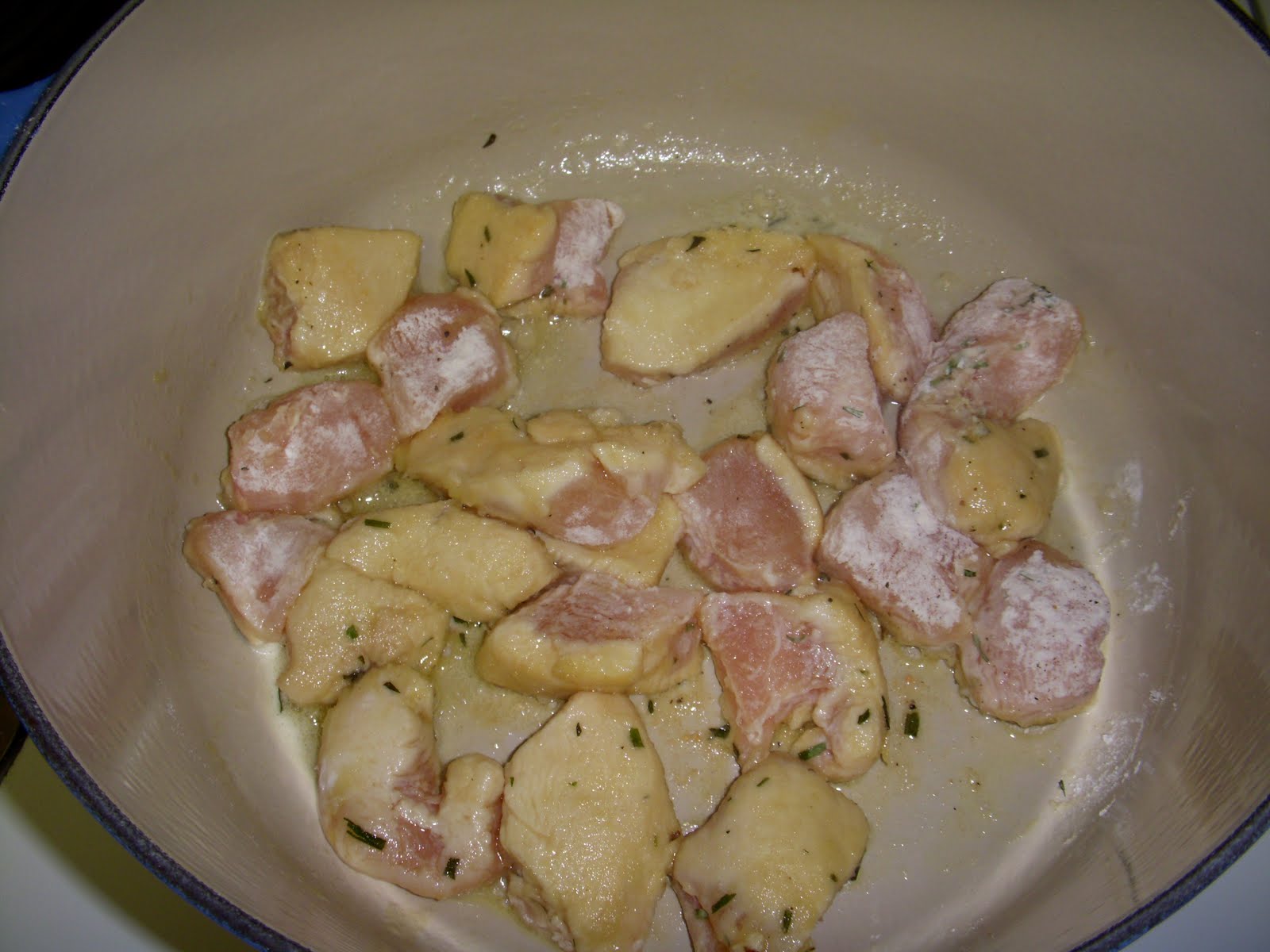 Flour, then brown chicken in large dutch with olive oil and butter over medium heat until chicken is done.