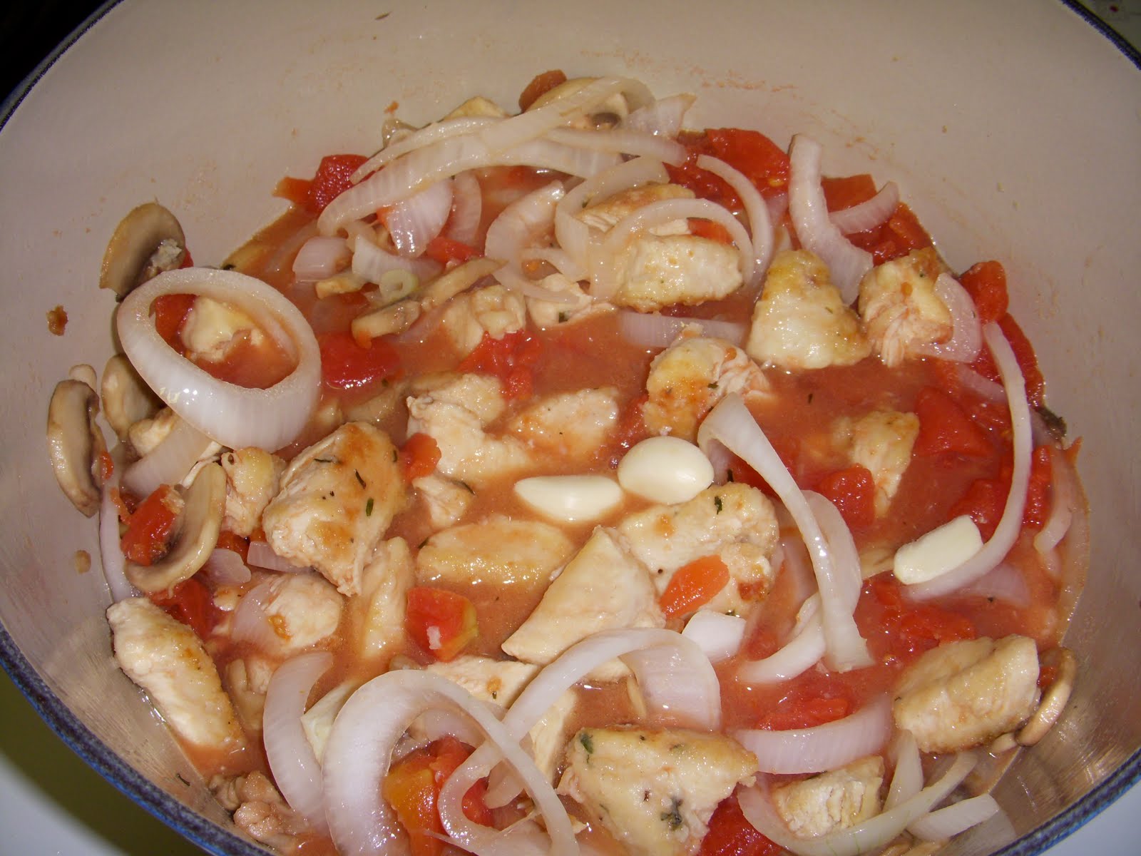 Remove chicken and cook onions and mushrooms in olive oil and butter until browned. Put chicken back in and add chicken broth, chopped tomatoes, black olives, and garlic. Bring to a boil and simmer for 40 minutes.