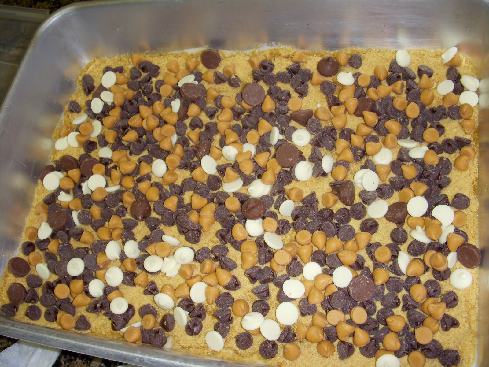 4. Layer butterscotch chips and chocolate chips over the crumbs.