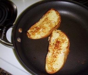4. Place a griddle over medium-high heat until hot. Lightly oil the griddle. Remove bread from egg mixture, letting the excess liquid drip back into the bowl, and place on the hot griddle. Cook until the bottoms are golden brown, about 2 minutes per side.