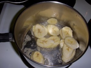 6. Meanwhile, make the caramelized bananas. Peel the bananas and slice diagonally. In a large frying pan, melt the butter over medium-high heat. Add the banana slices and cook, gently turning them occasionally, until they begin to brown, 2-3 minutes.