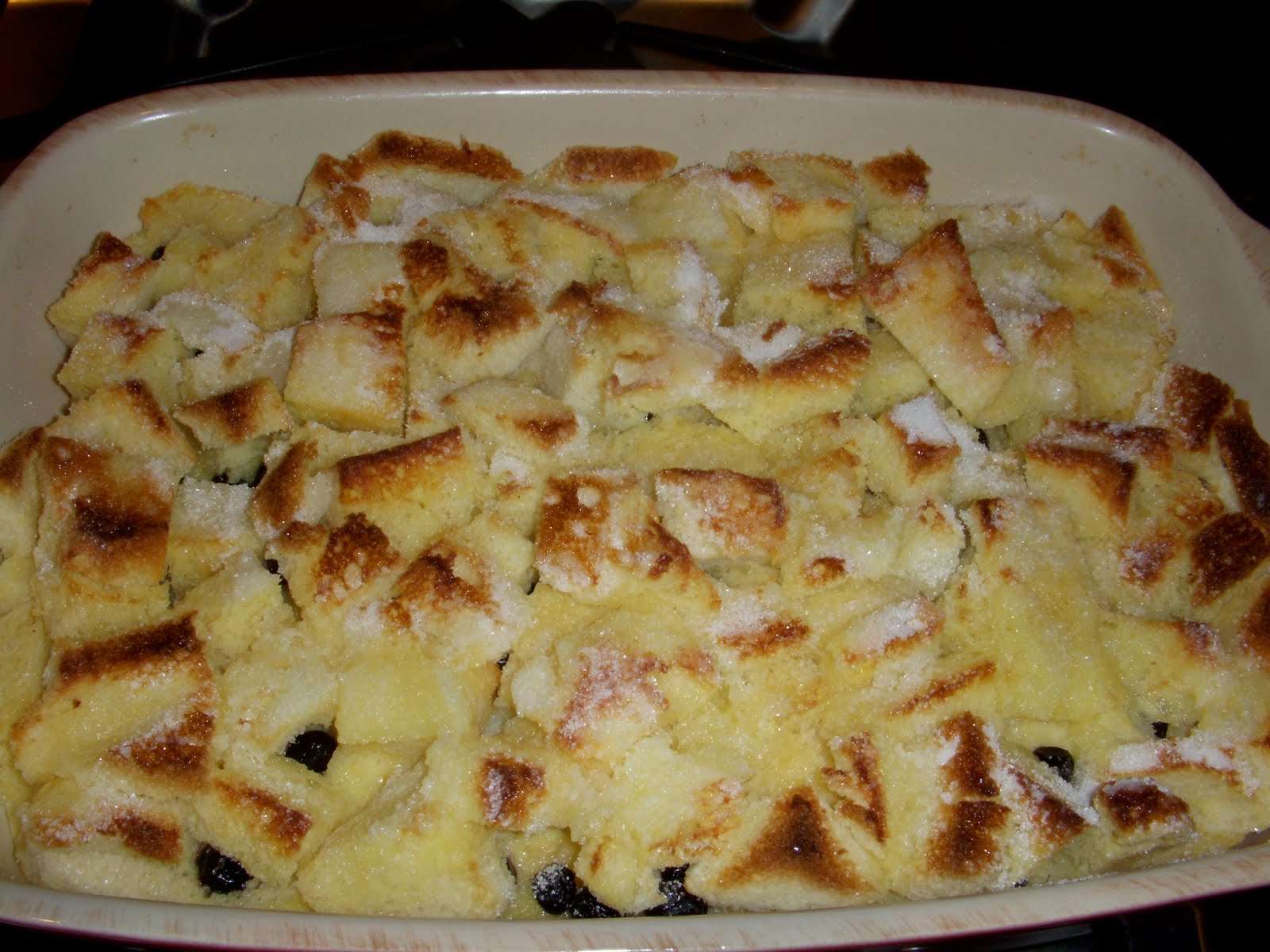 5. Bake the pudding for 40 minutes. Carefully remove the foil and discard. Sprinkle the top of the pudding with the remaining sugar. Bake for 10 minutes more to melt the sugar and create a glaze. Carefully remove the bread pudding pan from the water bath and allow to cool in the pan.