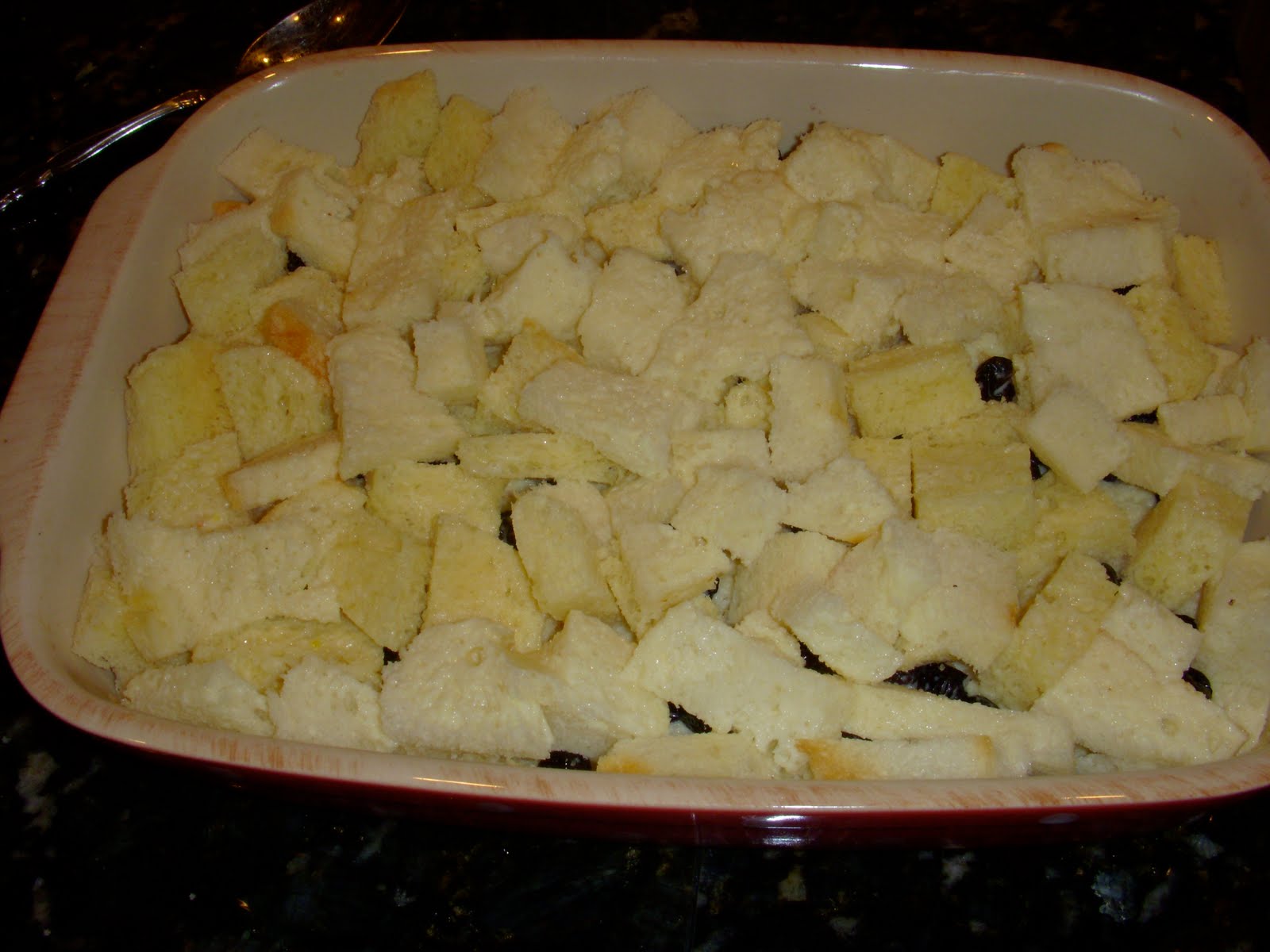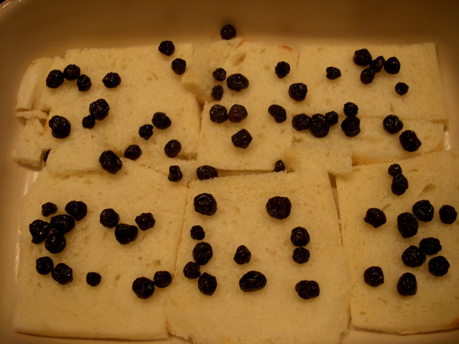 2. To prepare the bread pudding, trim the crust from the brioche. Set aside. Soak the dried blueberries in hot water to cover until softened, but not mushy. Drain and set aside.