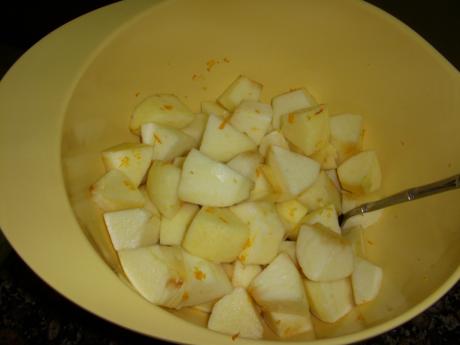 Peel, core, and cut apples into 8ths. Cut each wedge into three chunks.