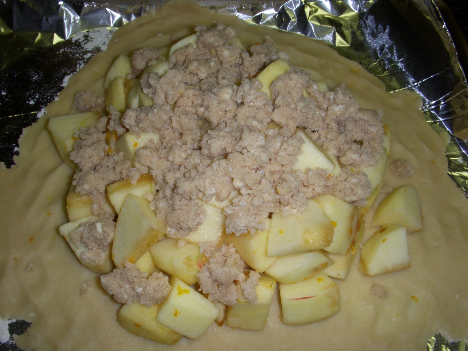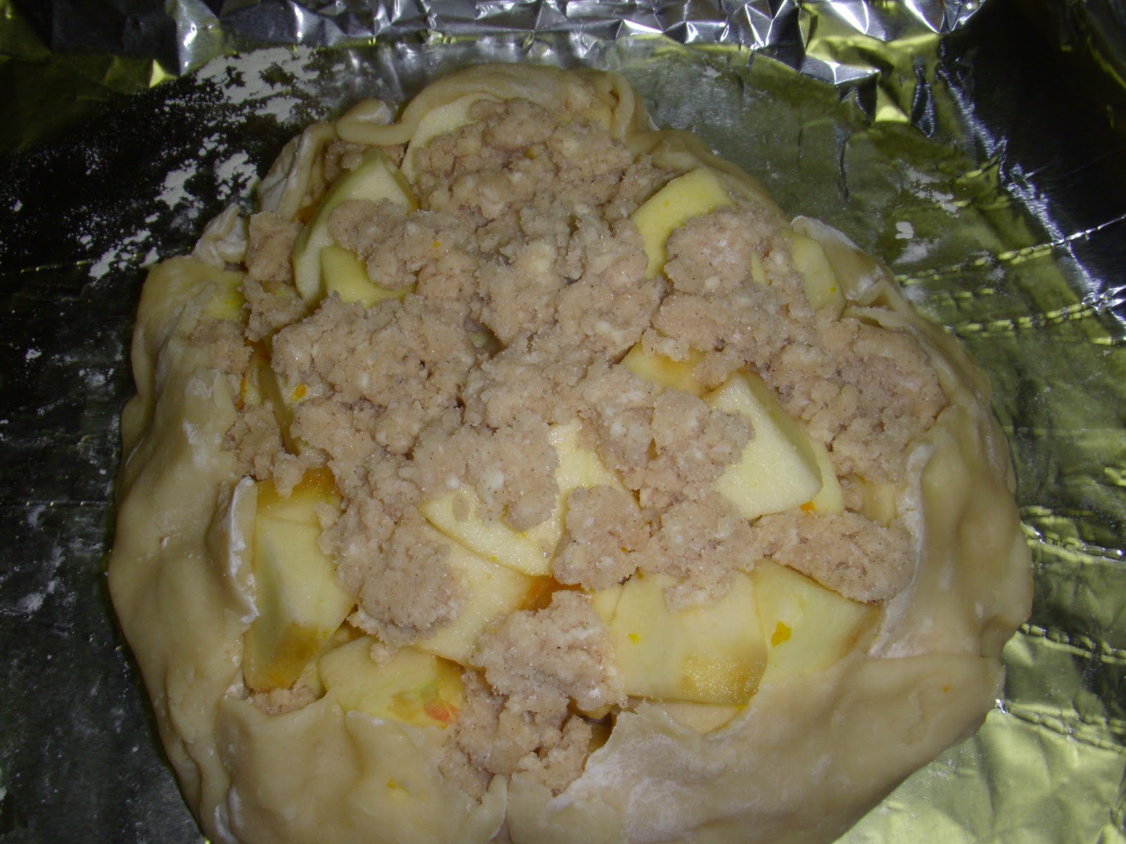 Pour apple chunks onto pastry dough, leaving a 1 1/2-inch border. Sprinkle apples with crumble.