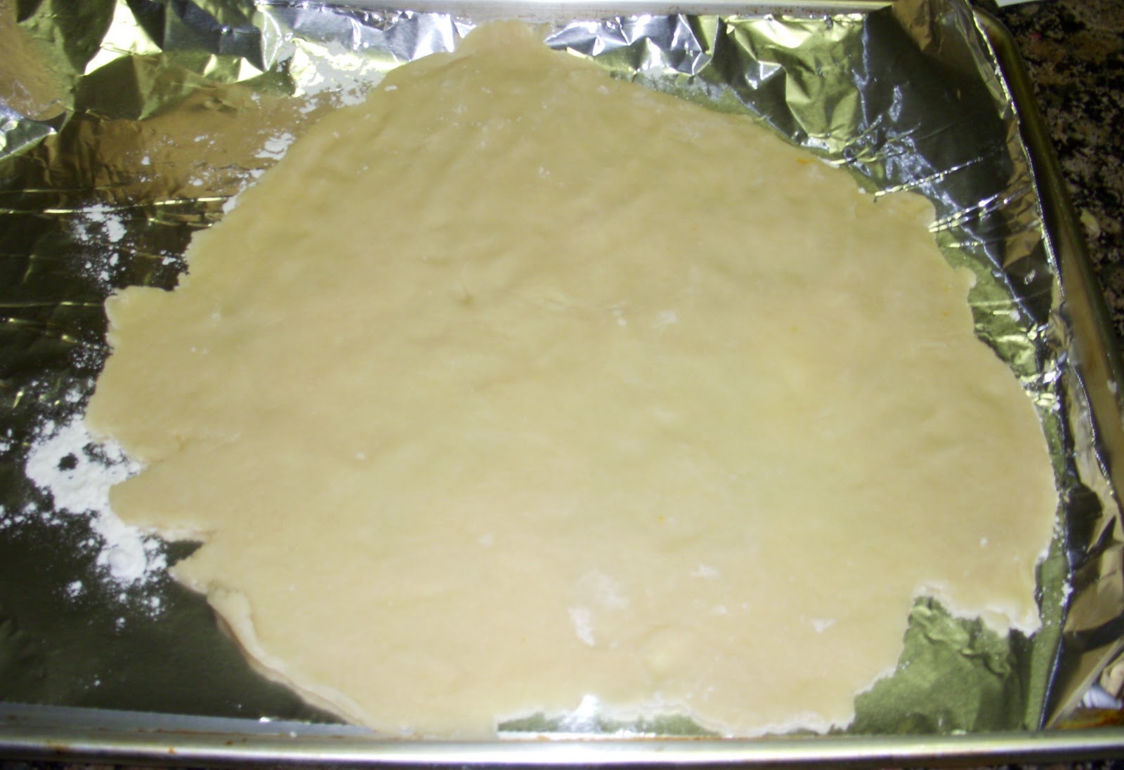 3. Flour a rolling pin and roll the pastry into an 11-inch circle on a lightly floured surface. Transfer it to a baking sheet.