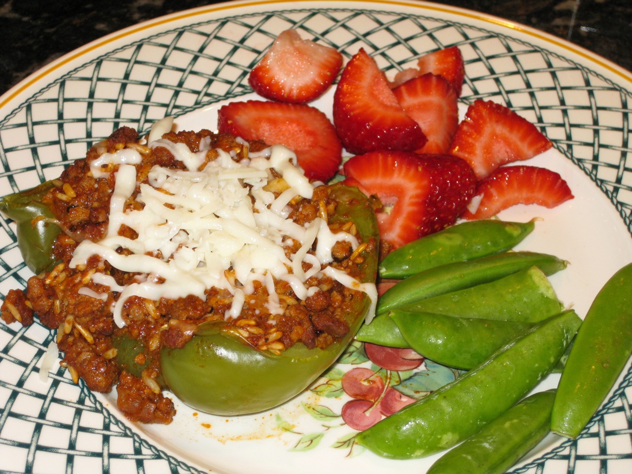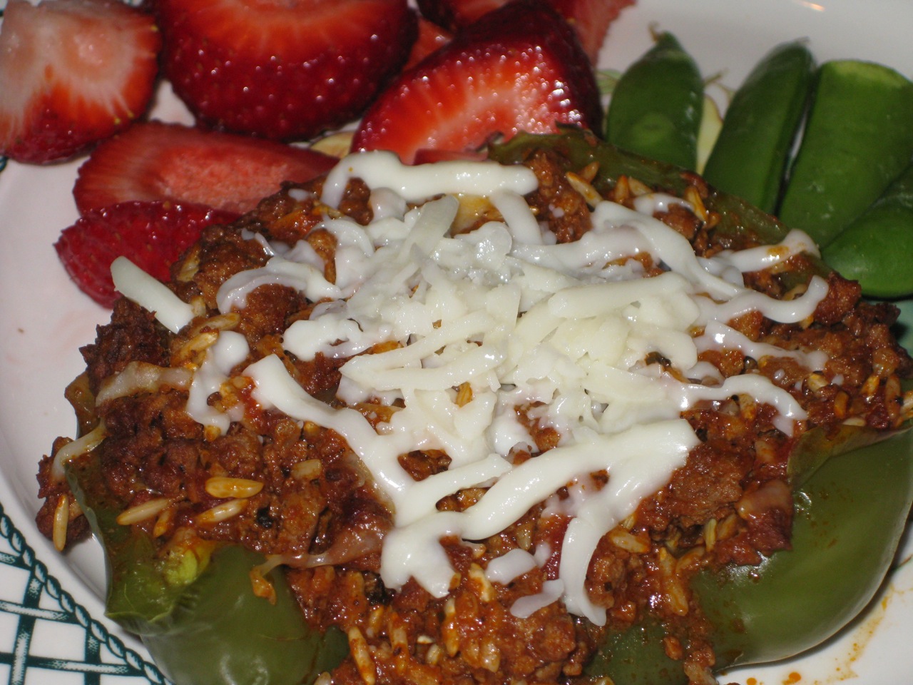 3.  Fill bell pepper halves with beef mixture;  sprinkle evenly with cheese  Place in baking dish.  Bake, uncovered, at 350 degrees for 20 to 25 minutes. (or microwave at HIGH 2 to 3 minutes or until cheese melts.)