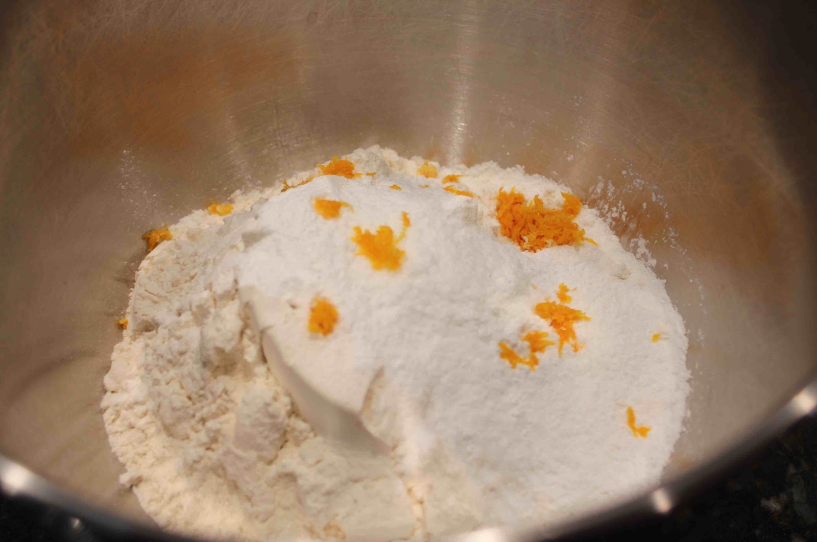 2. In the bowl of an electric mixer fitted with a paddle attachment, mix 4 cups of flour, 1/4 cup sugar, the baking powder, salt and orange zest. Add the cold butter and mix at the lowest speed until the butter is the size of peas.
