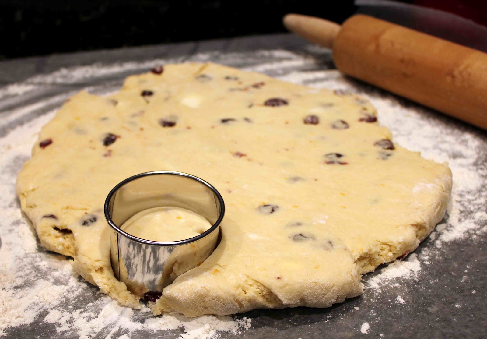 5. Dump the dough onto a well-floured surface and knead it into a ball. Flour your hands and a rolling pin and roll the dough 3/4 -inch thick. You should see small bits of butter in the dough. Keep moving the dough on the floured board so it doesn’t stick. Flour a 3-inch round plain or fluted cutter and cut circles of dough.