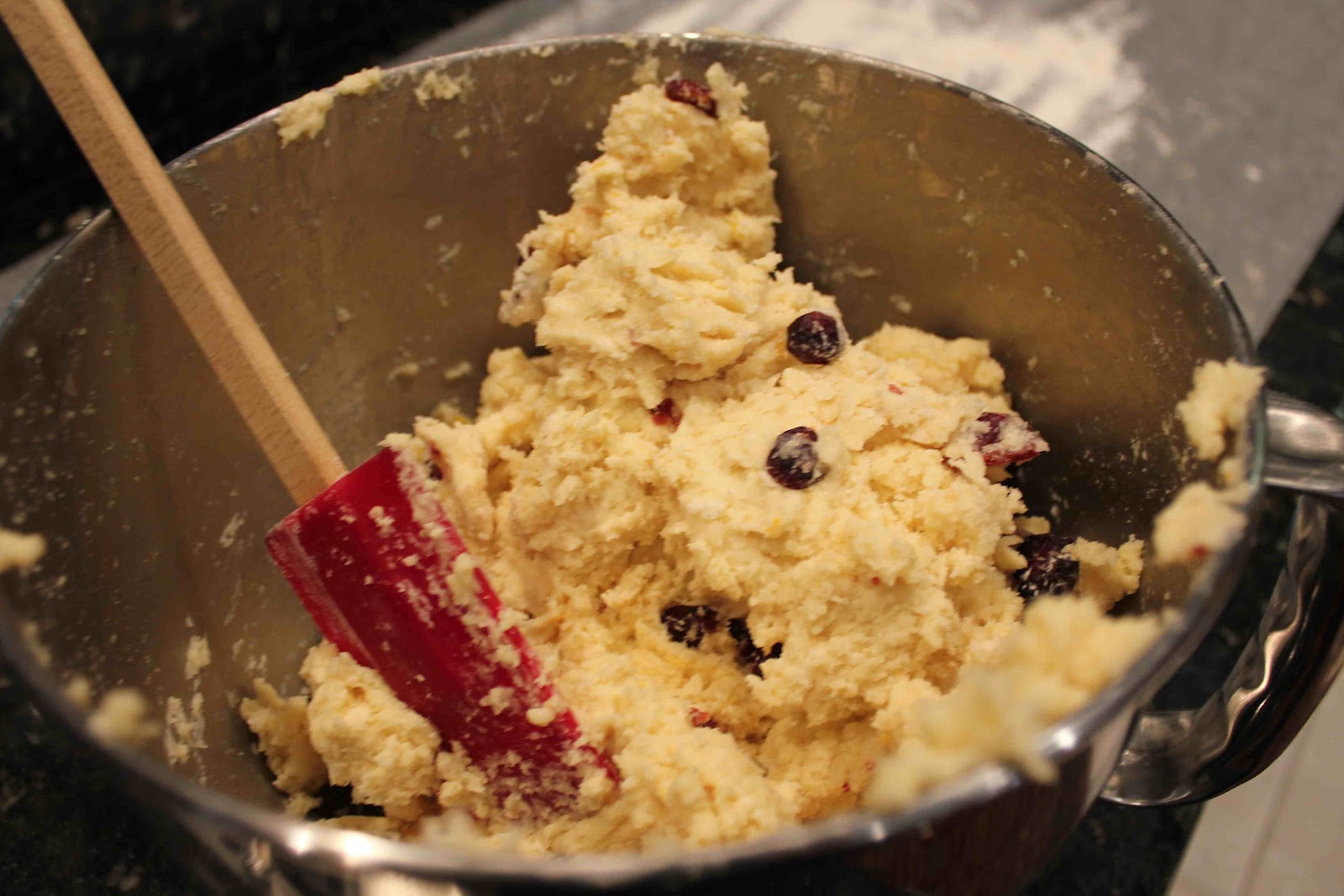 4. Combine the dried cranberries and 1/4 cup of flour, add to the dough, and mix on low speed until blended.