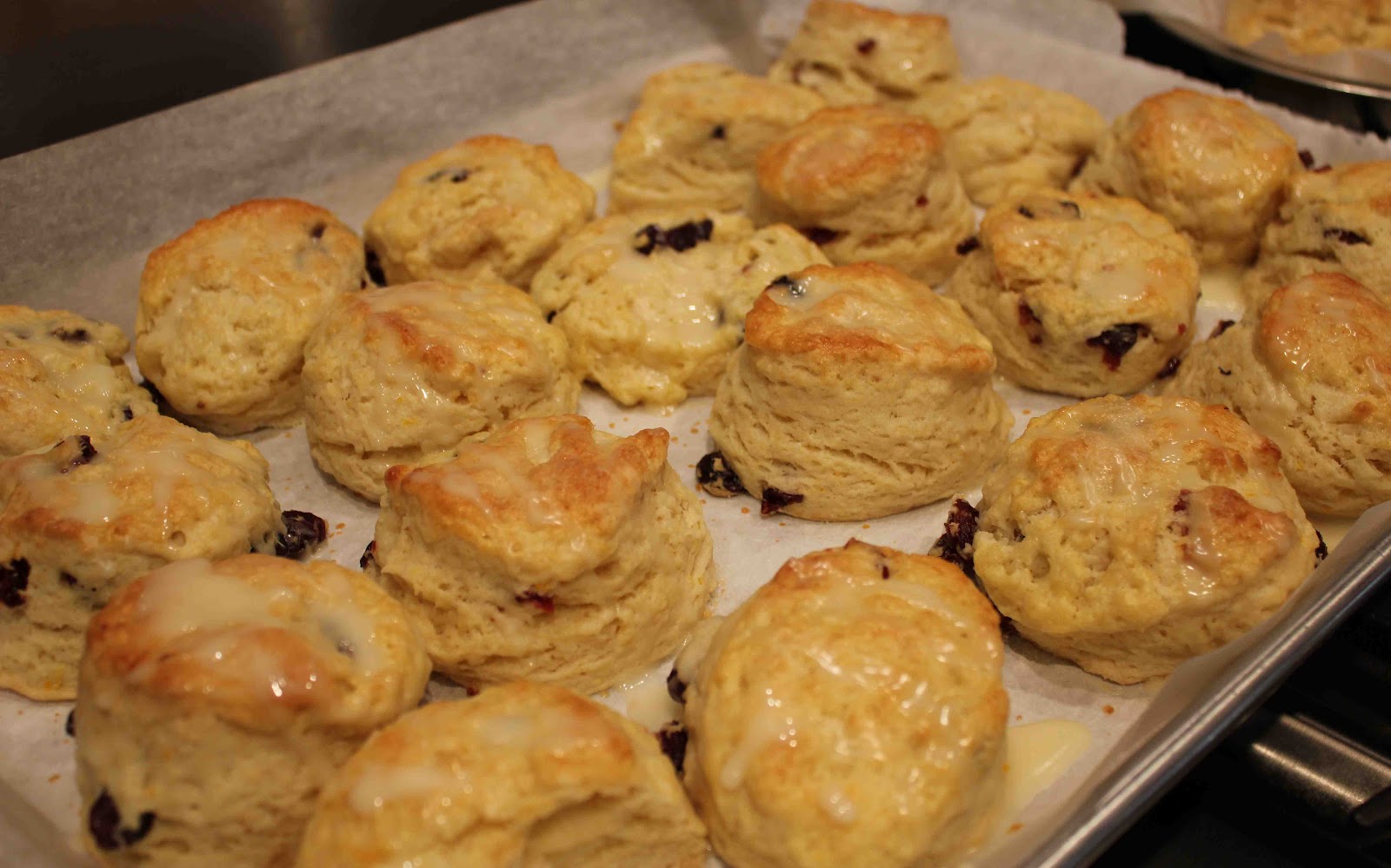 7. Brush the tops of the scones with egg wash, sprinkle with sugar, and bake for 20-25 minutes, until the tops are browned and the insides are fully baked. The scones will be firm to the touch. Allow the scones to cool for 15 minutes and then whisk together the confectioners’ sugar and orange juice, and drizzle over the scones.