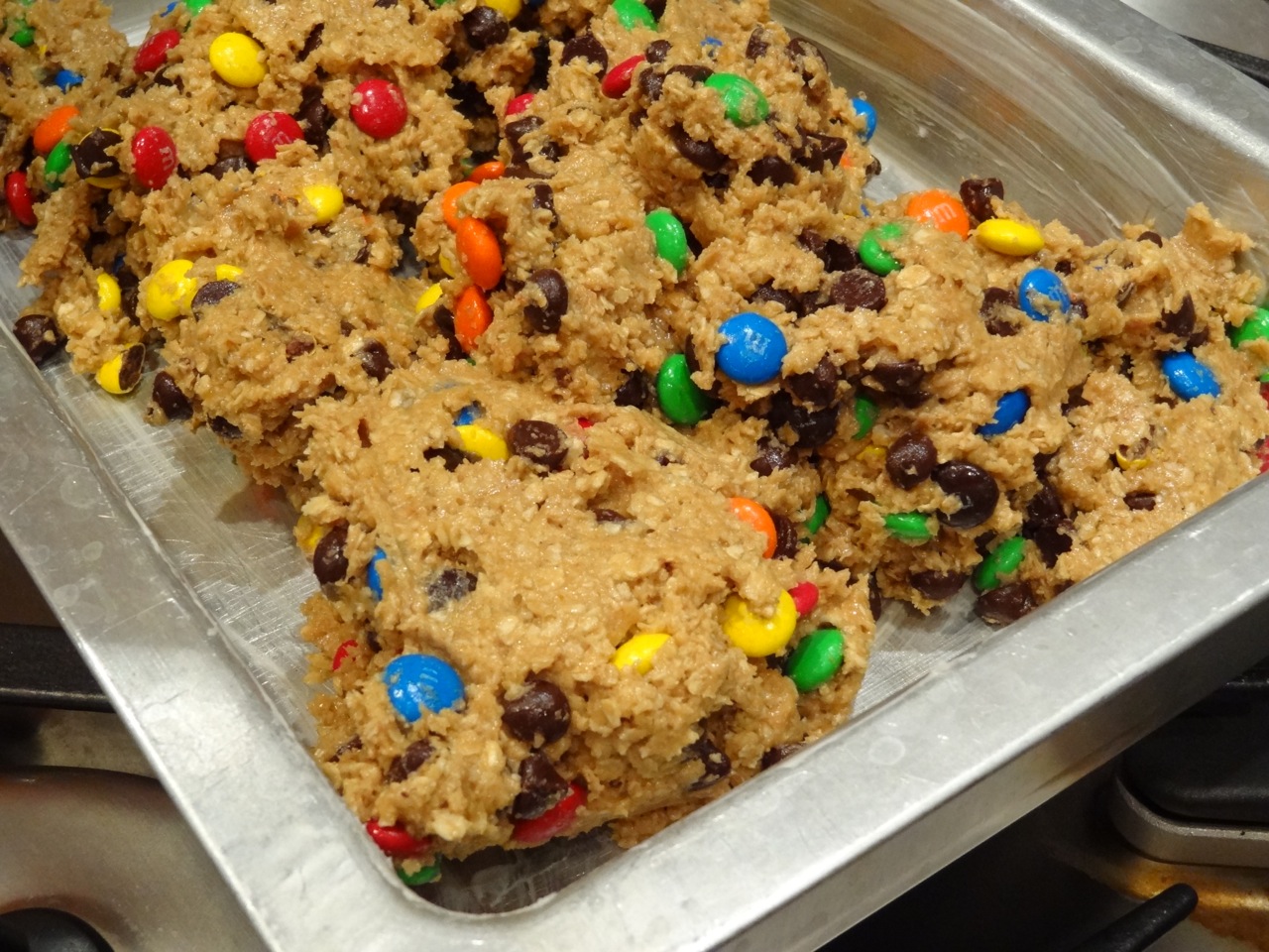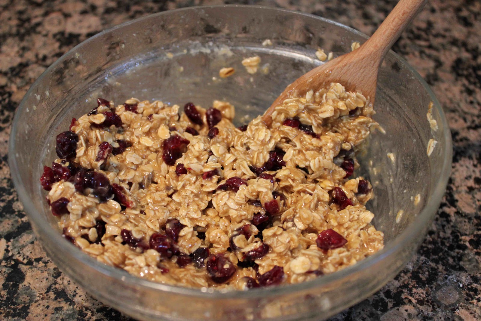 - In a large bowl, mix together the oats, brown sugar, wheat germ, flour, cinnamon and salt. Make a well in the center and pour in the honey, applesauce, egg, oil, and vanilla. Mix well using your hands.