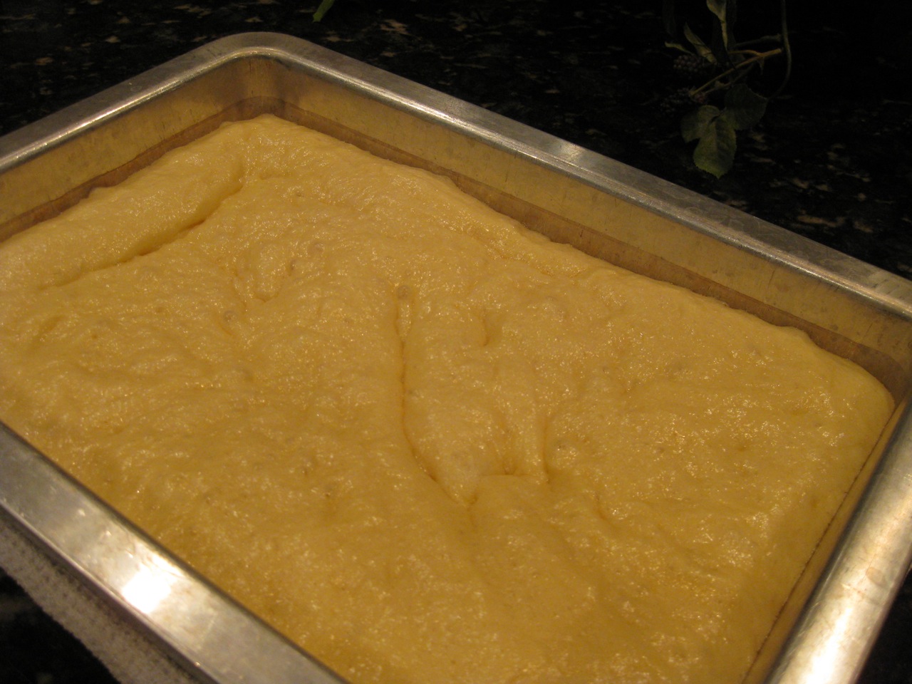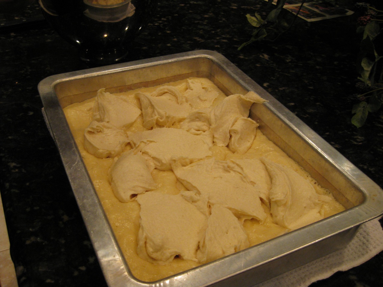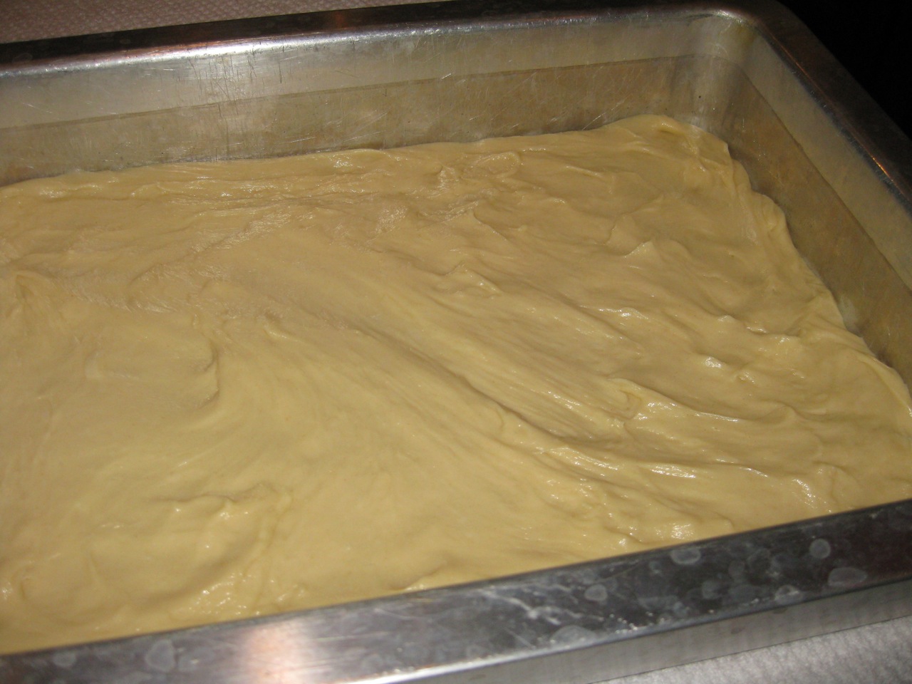 3. Press dough into an ungreased 9-by 13-inch baking dish at least 2 inches deep. Cover dish with plastic wrap or clean tea towel, put in a warm place, and allow to rise until doubled, 2 1/2 to 3 hours.