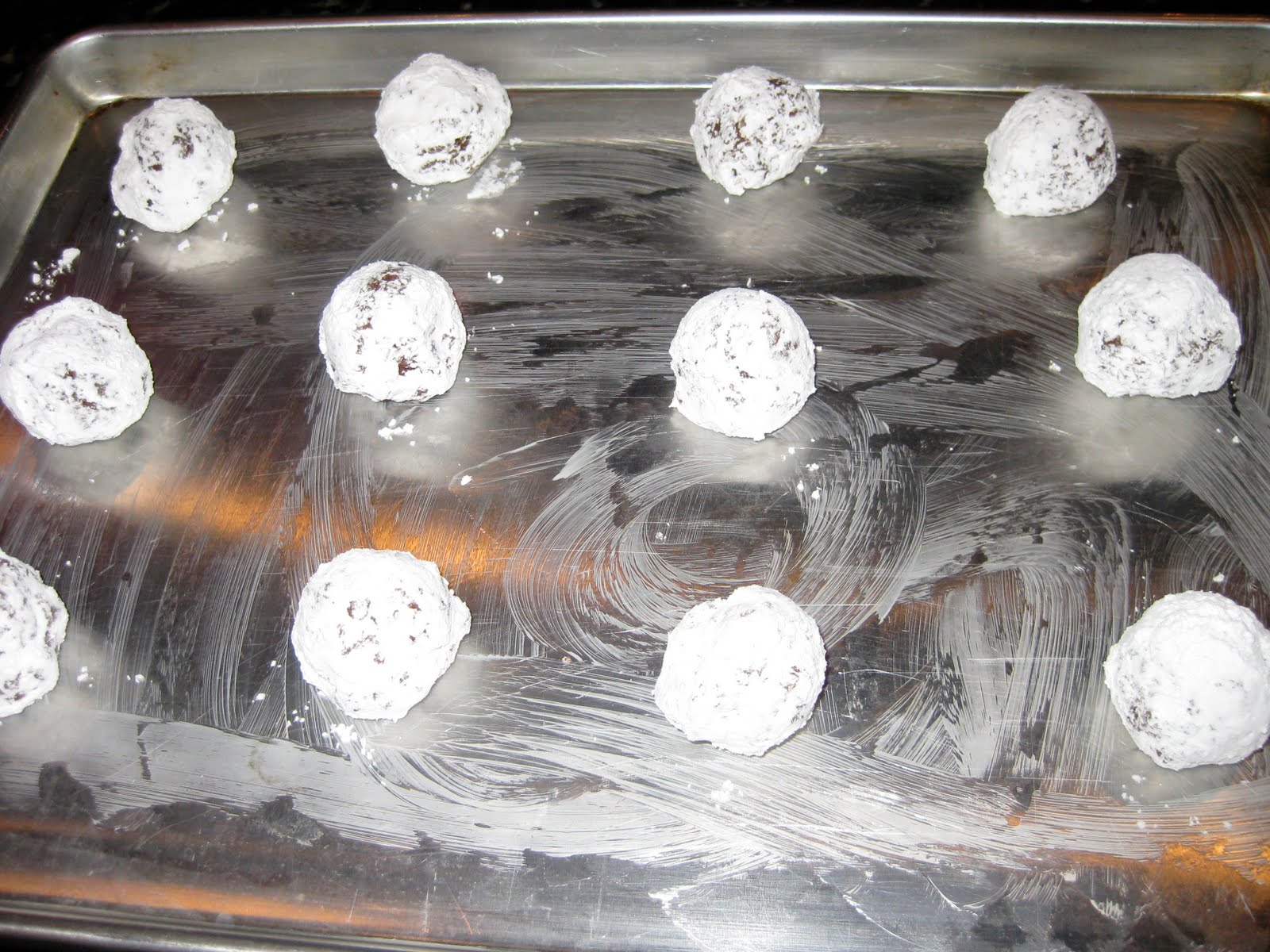 Scoop out a heaping tablespoon of dough and roll into a ball. Coat generously with powdered sugar and transfer to a baking sheet.
