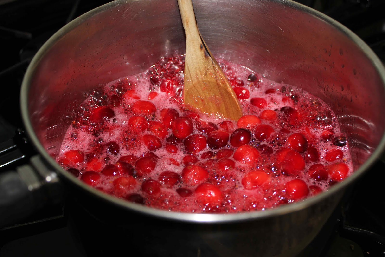 2. Add cranberries, return to boiling and stir occassionally until thier skins pop.