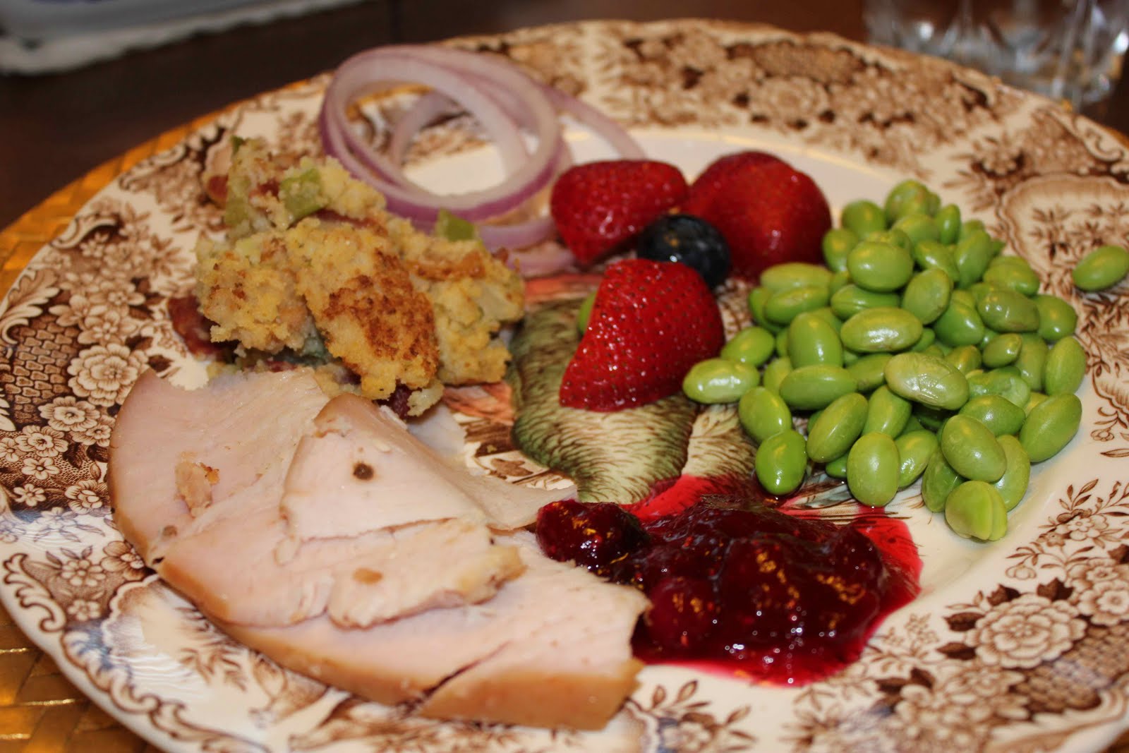Needless to say, my stuffing was good. For the turkey, I had Matt buy some turkey breast from Spring Creek BBQ (which was a little weird because the turkey was smoked. I’m used to roasted turkey on the real day, but it was good none-the-less). We had fruit, corn on the cob for Matt, and shelled edamame for me as a side.