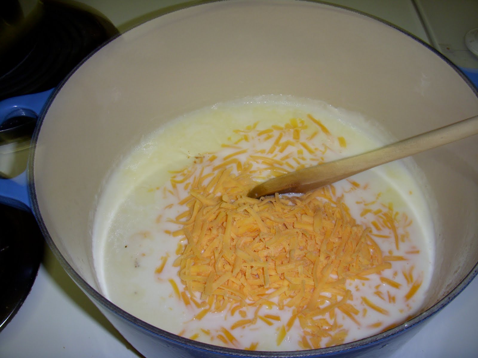 Add flour, milk, and cream, and stir until thickened and beginning to bubble.