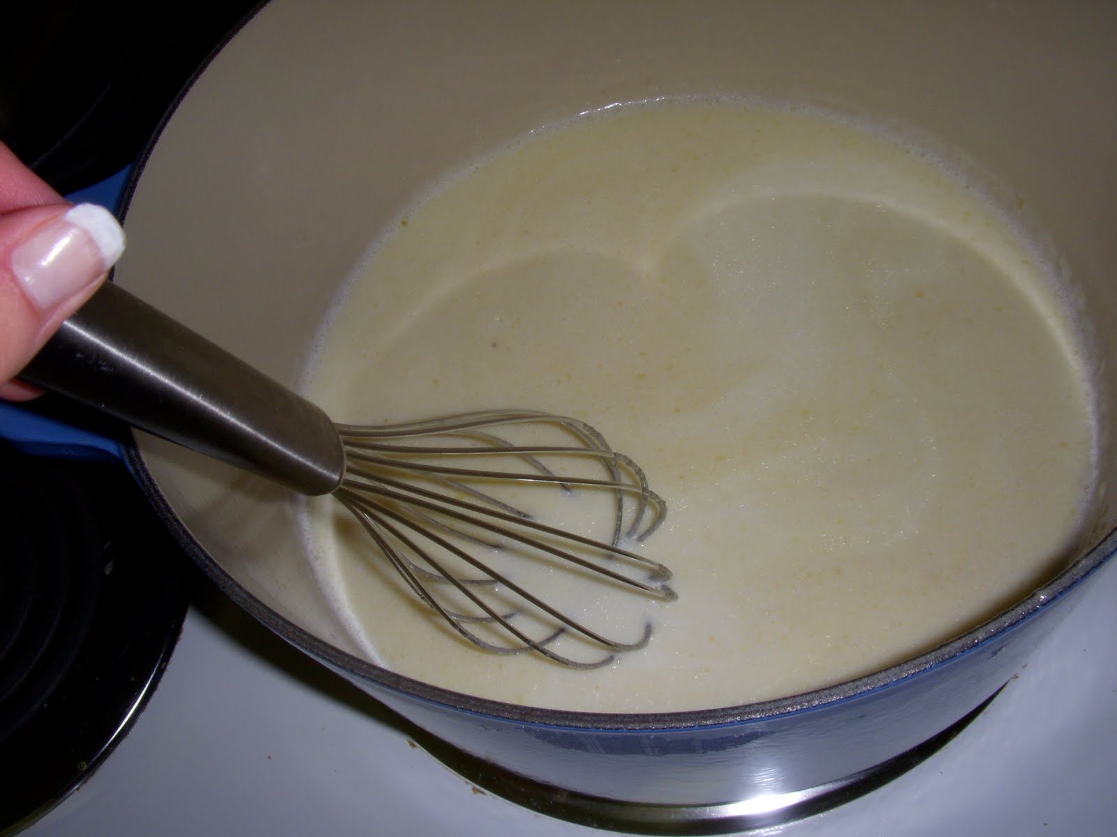 4. Add the flour and using a wire whisk, stir the flour and butter while pouring in the milk, a little at a time. Keep stirring with a whisk until there are no lumps.
