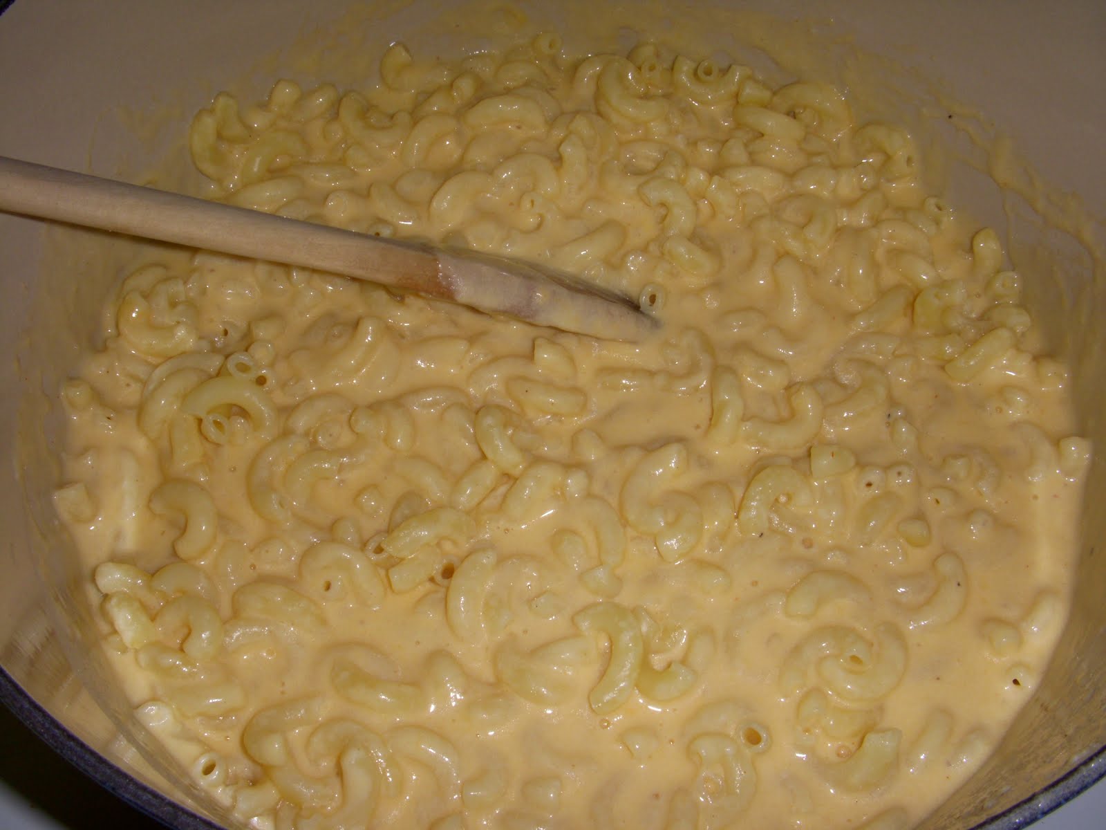 7. Pour the cheese sauce over the cooked macaroni in its large saucepan. Stir to mix well, then pour into the greased baking dish.