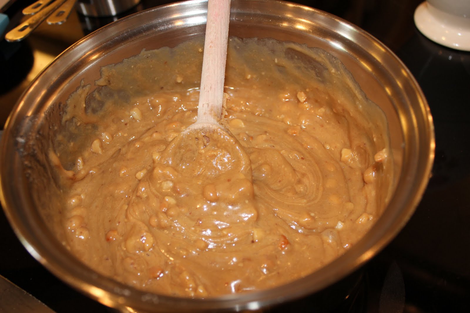 2. In an electric mixer, cream the butter and sugars until smooth. Beat in the eggs and baking soda. Then ddd the peanut butter and beat until smooth.