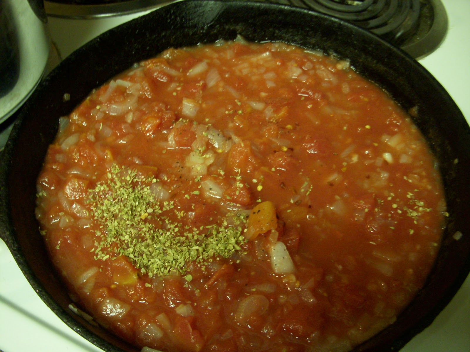 2. Add the tomatoes and bring to a simmer, reduce heat and let simmer for 5-10 minutes, until the juices thicken a bit.