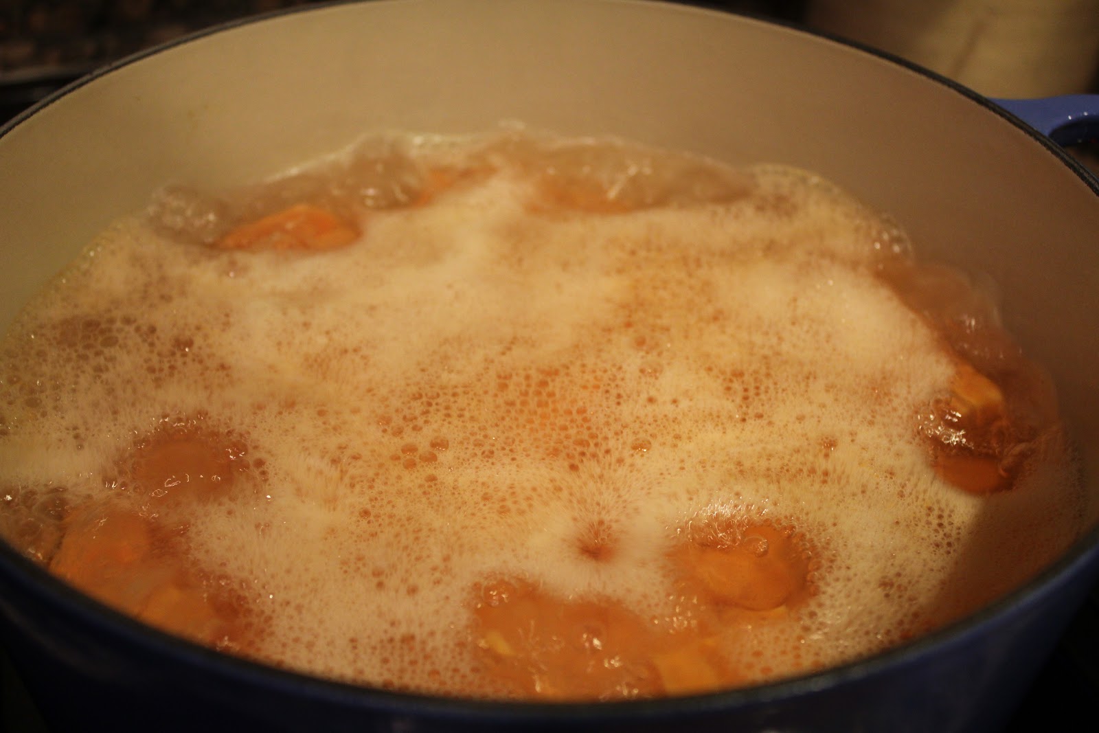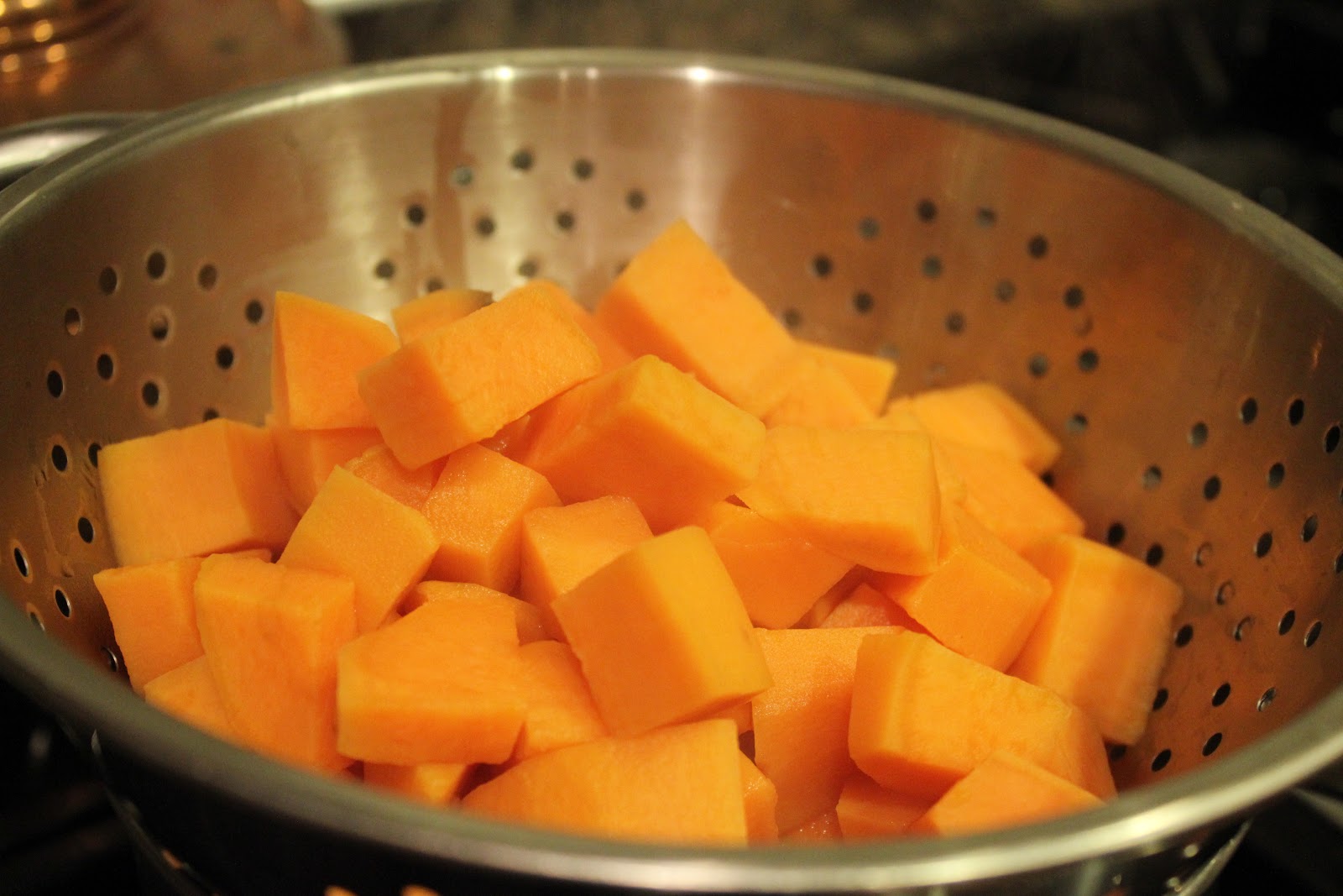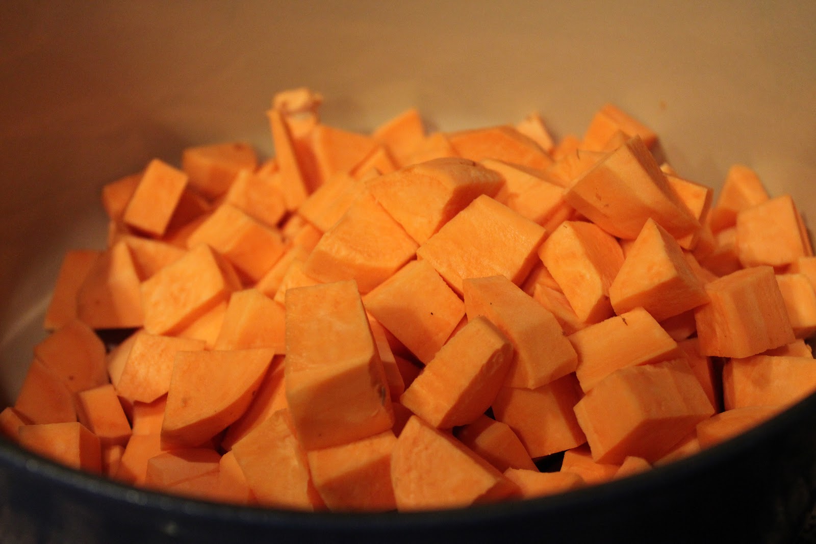 3. FOR THE FILLING: Cut sweet potatoes in 1-inch cubes. Cover with water. Bring to a boil and simmer for 15 minutes, or until soft. Drain potatoes. Using a potato masher, measure out 2 cups of mashed sweet potatoes.