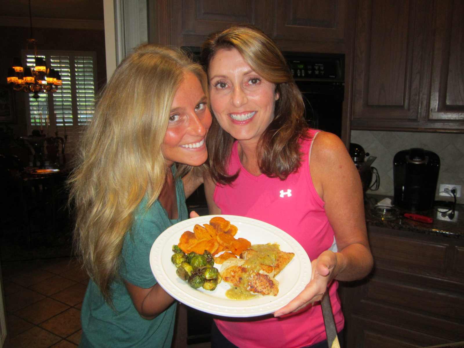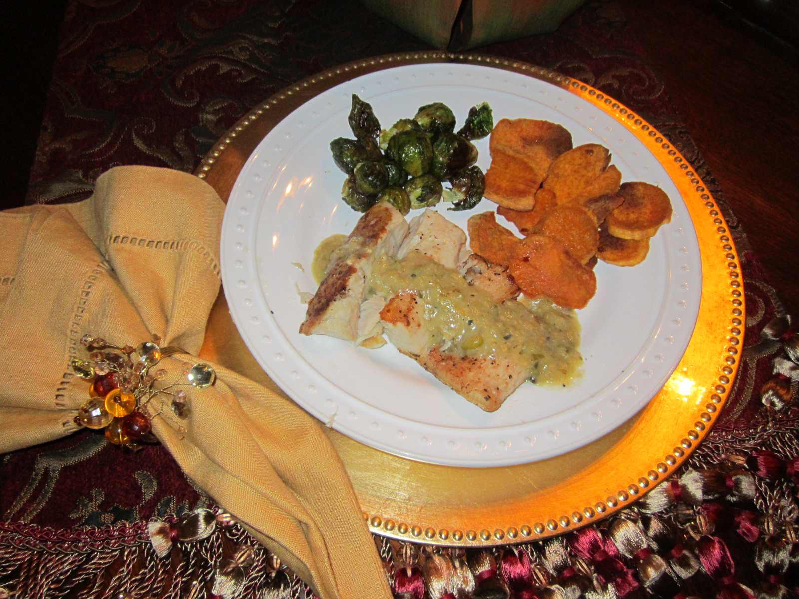 Pan-Seared Barramundi, Roasted Sweet Potatoes and Brussels Sprouts