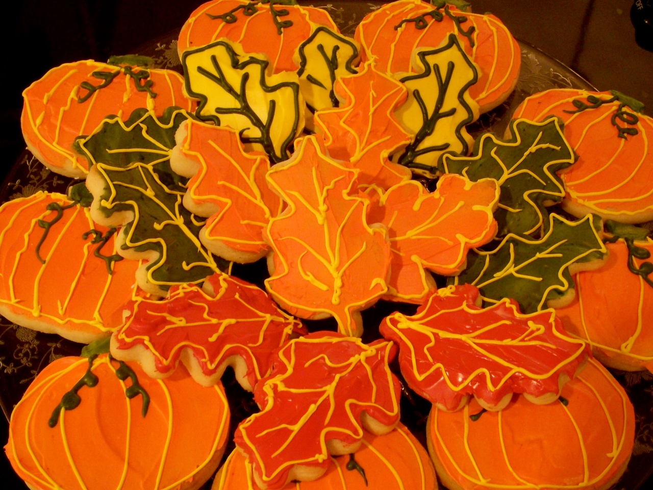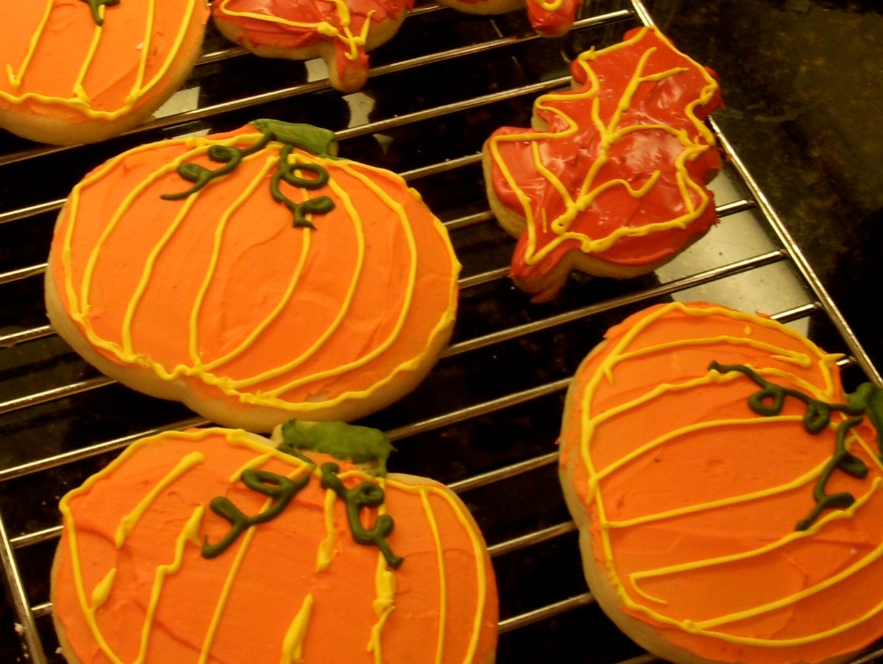 For the pumpkins, use the orange icing to cover the surface of the cookie. For the leaves, do the same with orange, green, yellow or red icing. Next, we outlined each cookie in yellow icing. (Again, pipe it with a small hole cut out from the corner of a zip-lock bag). For the pumpkins, use green icing to great a stem and curly cues coming down. Use the remaining yellow icing (or color of choice) to pipe the veins of the leaves and the lines of the pumpkins.