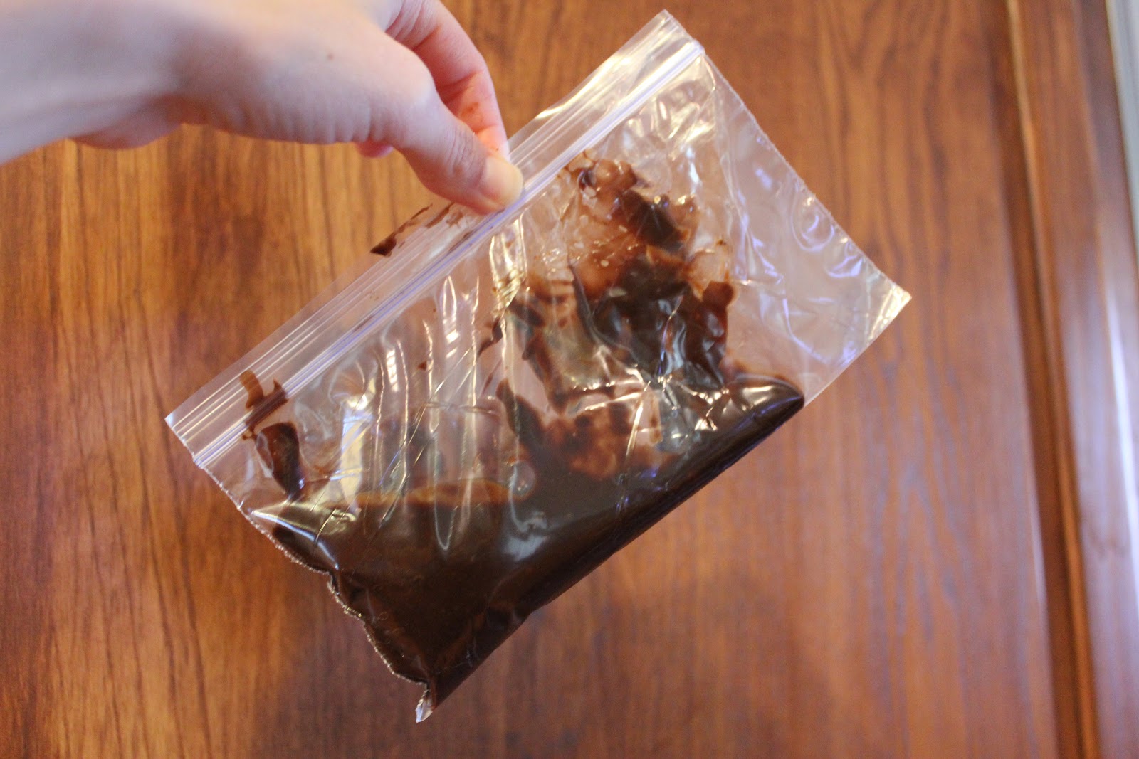 | Place chocolate mixture in a small plastic bag. Cut a tiny hole in the corner. |