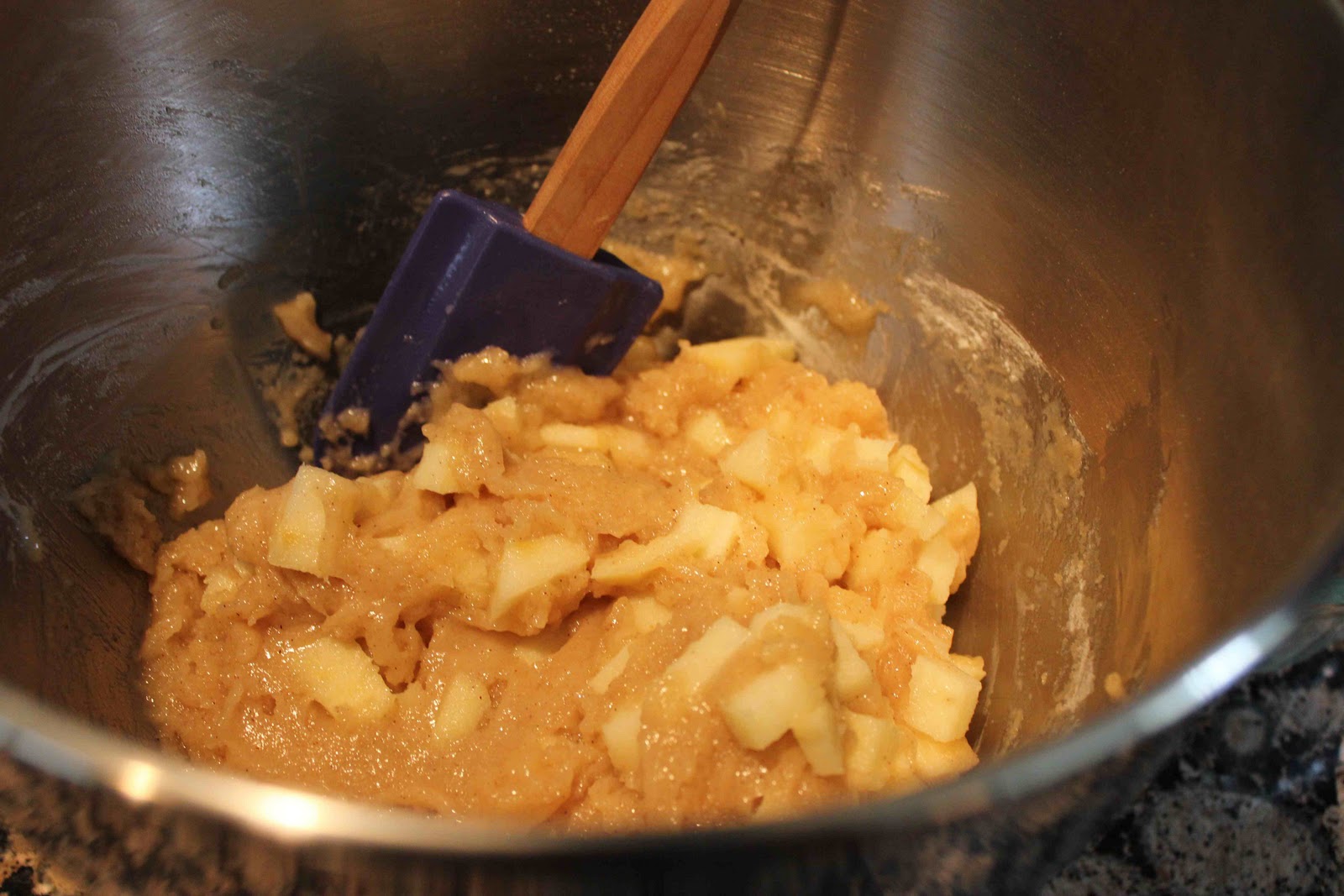 4. Stir in the flour mixture with a spoon and continue stirring the batter until the flour disappears. Add the apples and nuts (if using) and stir to mix them into the batter.