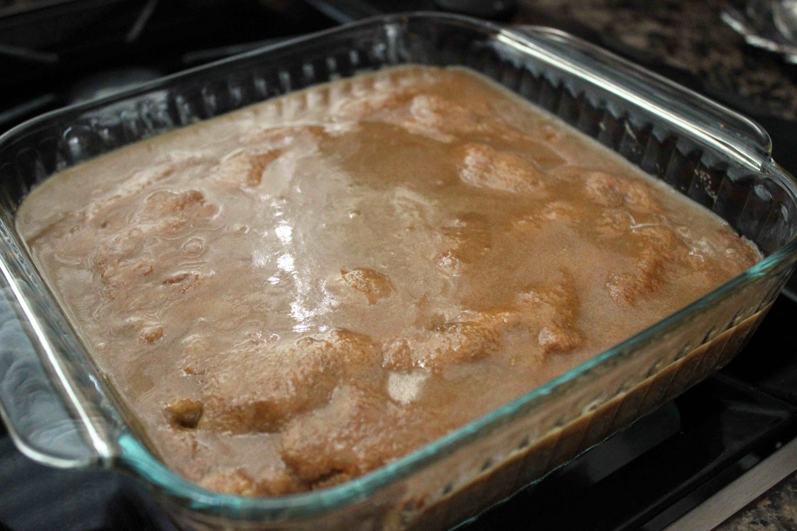 8. Spoon the hot glaze over the still hot-from-the-oven cake. Let the glazed cake cool completely before serving straight from the pan.