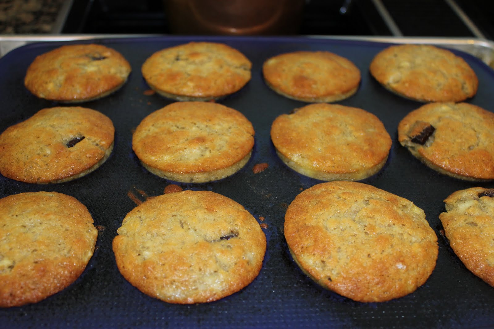 - Place 12 muffin-cup liners in muffin cups, and coat liners with cooking spray. Divide batter evenly among prepared muffin cups. Sprinkle remaining 1/4 cup chocolate chips evenly over batter. Bake at 400° for 15 minutes or until a wooden pick inserted in center comes out clean. Cool for 5 minutes in pan on a wire rack.
