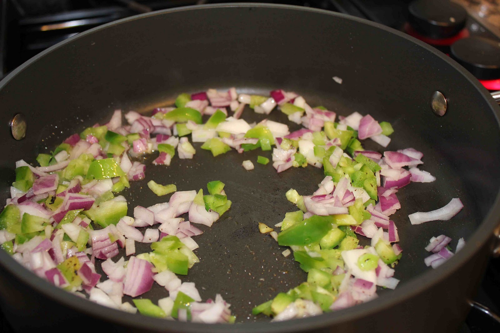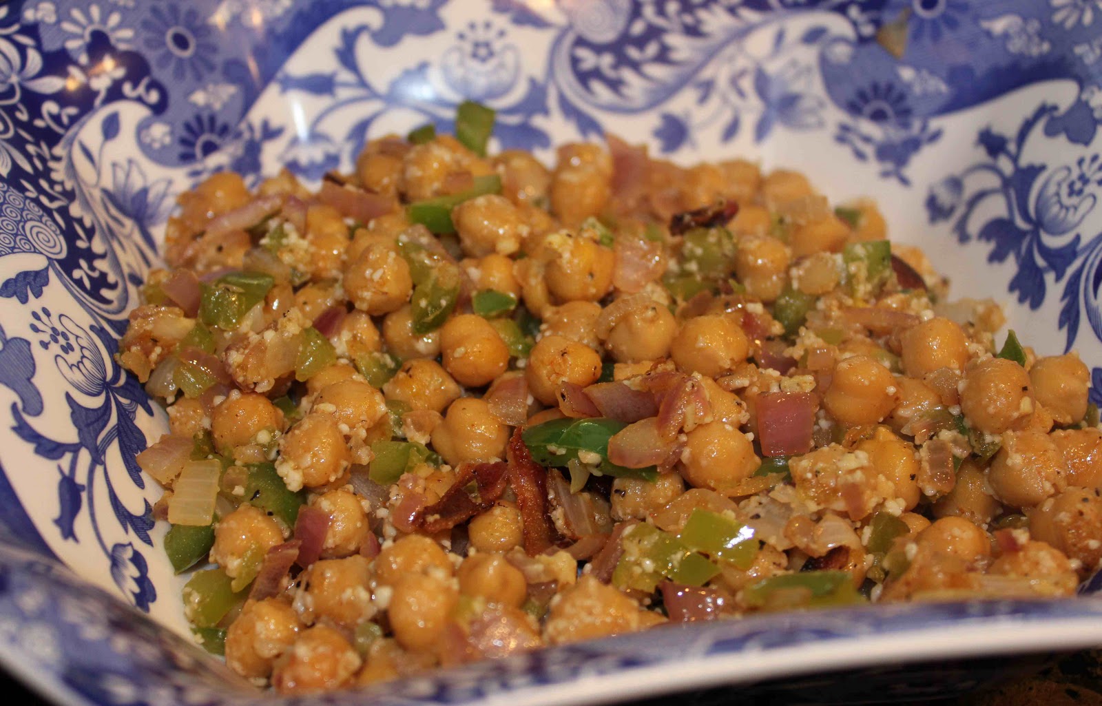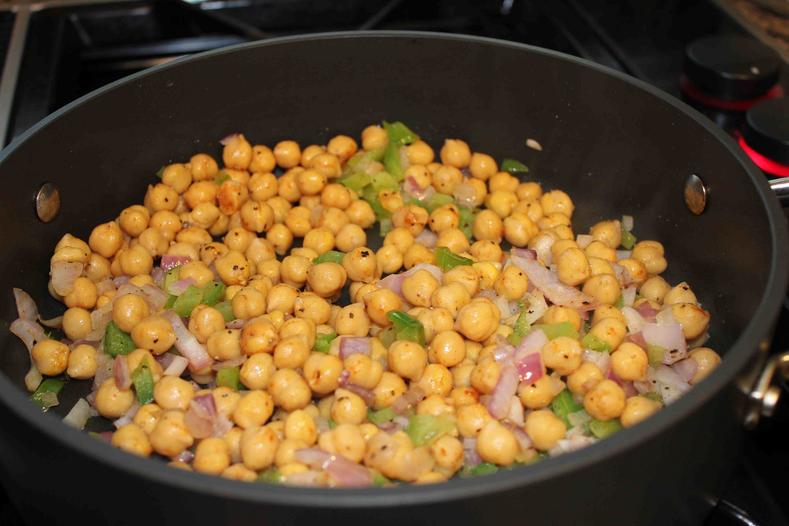 After roasting chickpeas, saute onions and peppers for 2 minutes.